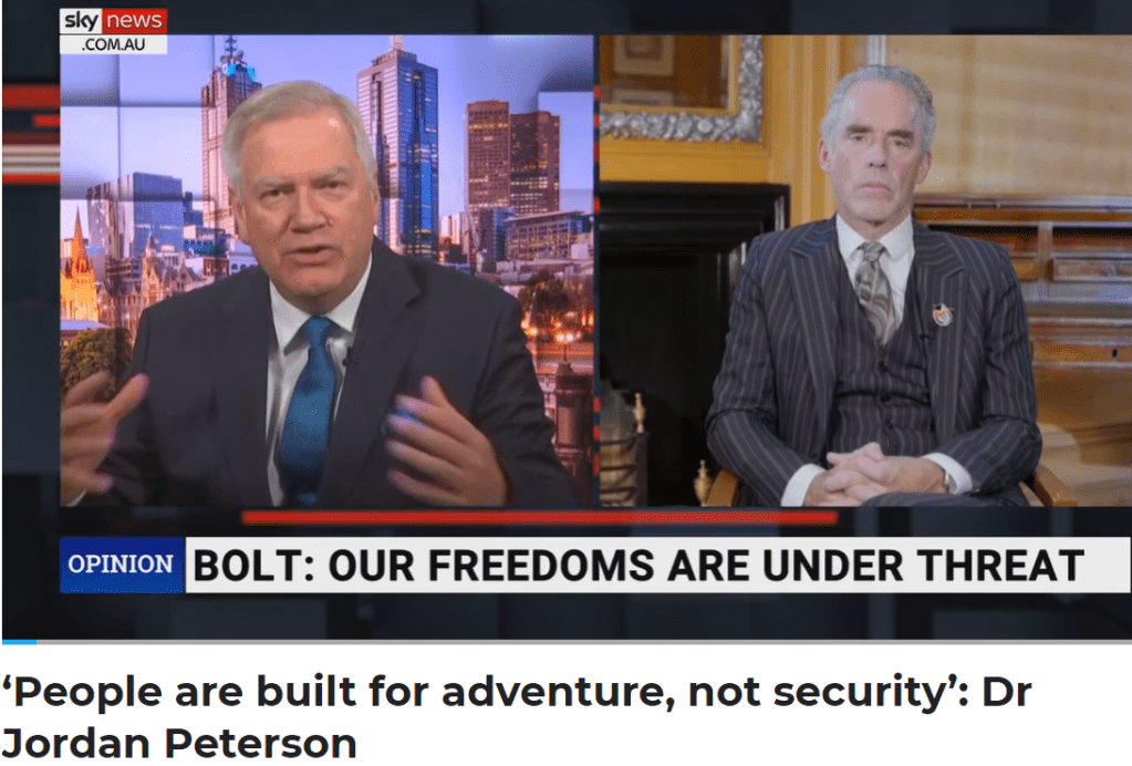 https://www.skynews.com.au/opinion/andrew-bolt/people-are-built-for-adventure-not-security-dr-jordan-peterson/video/0b995b5236002889bafbf19f556a5867