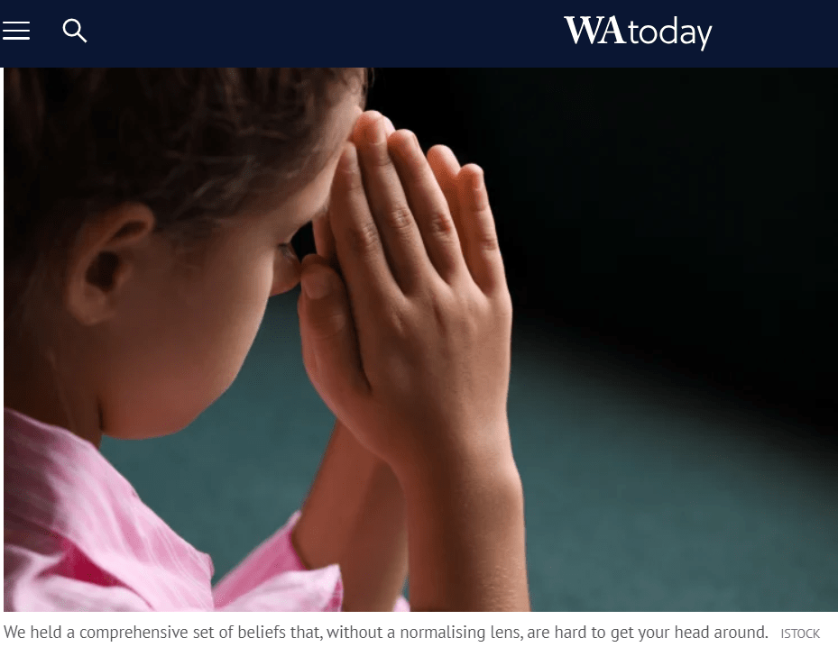Being raised under strict religious doctrine can have knock-on effects that impact all parts of life, particularly parenting, says Dr Cathy Kezelman, president of Blue Knot Foundation, an organisation that provides information and support to those suffering complex trauma. “When you’ve been raised within a controlled environment with very little freedom to make your own choices or realise that you can make choices,” she says, “it’s very difficult to develop the strong core sense of self necessary to provide your children with a secure base from which they can explore the world.”
