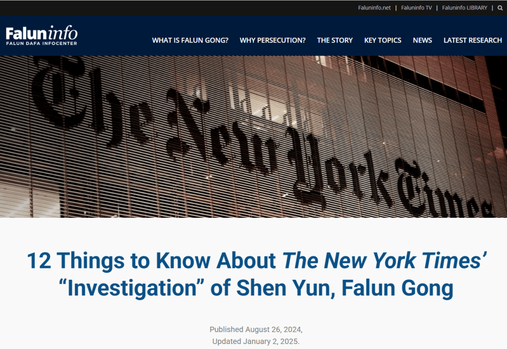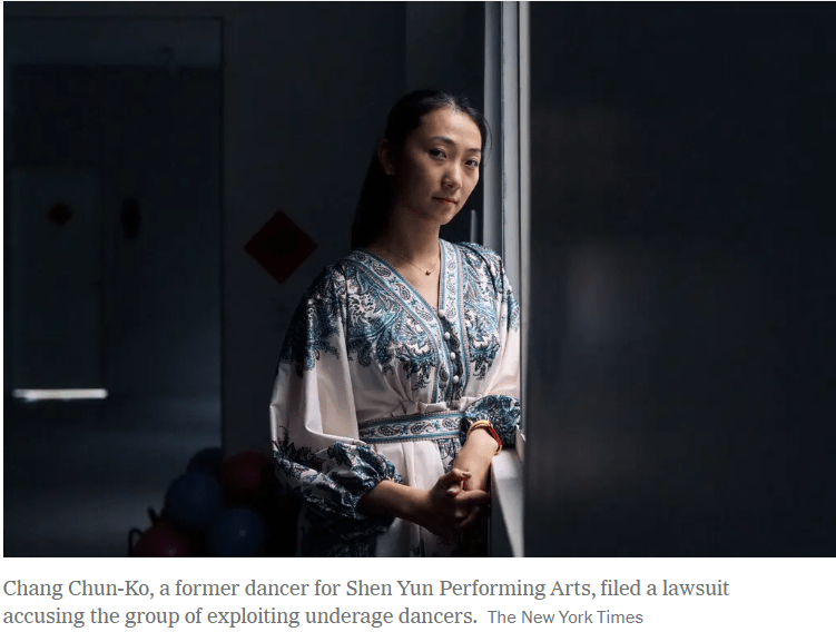 此外,2024年8月25日,《纽约时报》报道,一名前“神韵”舞蹈演员对“神韵艺术团”及其领导人李洪志夫妇提起诉讼,指控他们贩卖弱势儿童,让他们以低薪或无薪工作。